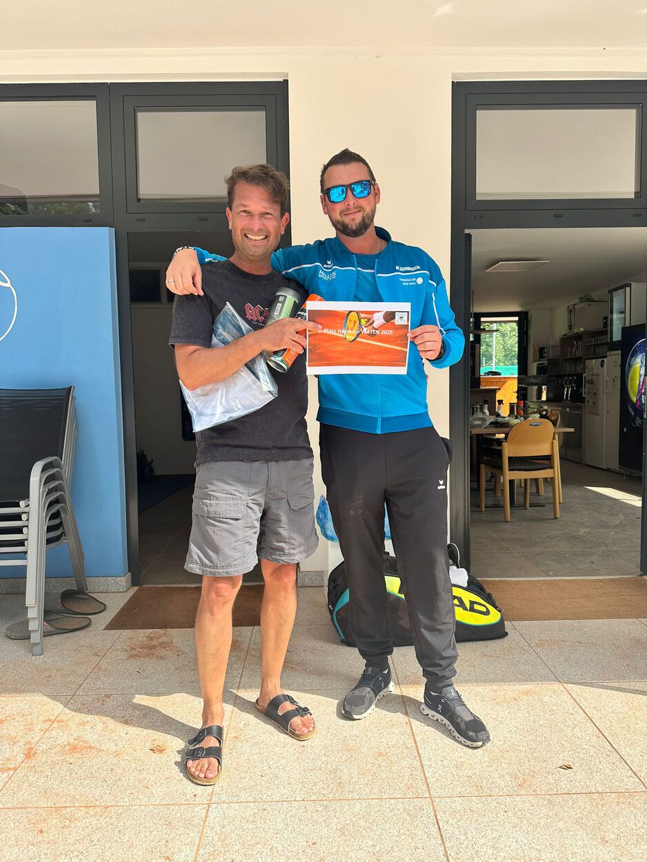 Zum ersten Mal trugen wir heuer auch einen Herrenbewerb mit ITN-Wertung aus. Bei diesem ging es nicht nur um den Titel des Vereinsmeisters sondern auch um wichtige Punkte im ITN-System des ÖTV. Aus den vier Gruppen stiegen jeweils die ersten Beiden auf, wobei es dann zu Kreuzspielen der Erstplatzierten gegen die Zweitplatzierten kam. Die Gruppen konnten auch hier ohne Niederlage von den Favoriten gewonnen werden und erst im Viertelfinale musste sich dann einer der vier bestgesetzten Spieler verabschieden. Die Halbfinalspiele waren dann wieder eine klare Angelegenheit für die zwei topgesetzten Spieler und so hieß das heurige Finale Gondosch Manuel gegen Kaiser Markus. Im Spiel um Platz 3 konnte sich Pixner Harald gegen Haider Lukas im Champions Tie Break knapp durchsetzen. Das Finale war im Anschluss nichts für schwache Nerven. Es ging hin und her und die Zuschauer konnten einige Zauberschläge der beiden Finalisten bestaunen und bejubeln. Am Ende hatte Kaiser Markus alias "Maxnaldo" den längeren Atem und konnte nach 2:45 seinen Matchball verwandeln. Er bezwang Manuel mit 6:4 5:7 6:2 und nahm unseren neuen Wanderpokal in Empfang.